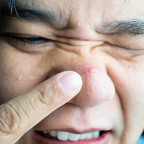 Images that contain skin troubles such as acne, pimples, dead skin and blackheads, Part of a face or body skin that has redness due to its sensitivity, Skin treatment ingredients in trend such as Centella Asiatica ∙ Allantoin ∙ Betaine ∙ Tea tree ∙ Gold, The scene of skin treatment using such ingredients, Close-up images of a face or body.