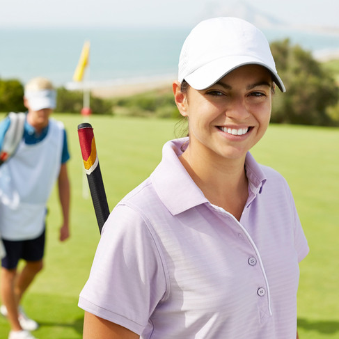 Images of a young person enjoying the time at indoor/outdoor/screen driving range and golf field, Images of a young person at such places with their parents, People moving from a hole to a hole in a golf cart with a caddie, Golfers taking a round while listening to the advice from a caddie holding a golf club, Image of a caddie alone.
